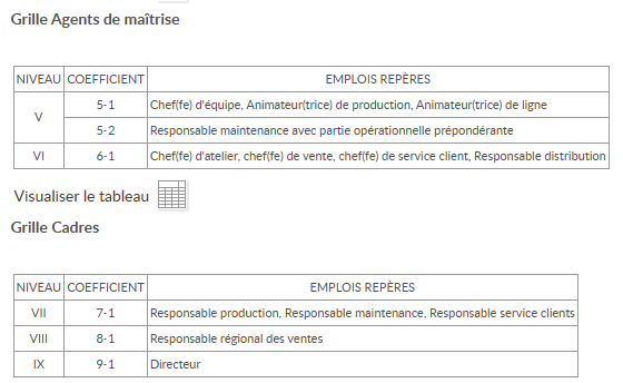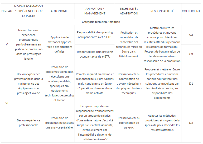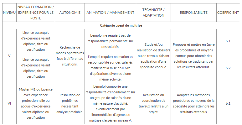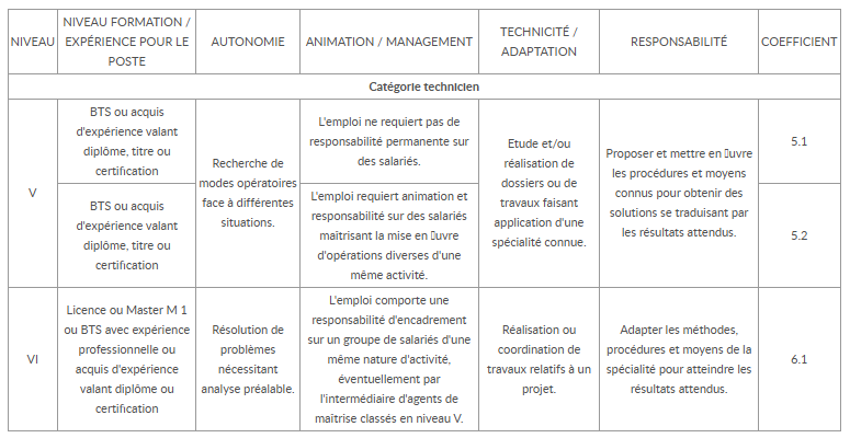 Les niveaux V et VI se rapportent aux techniciens et maîtrise et portent sur les coefficients 5.1 à 6.1 (3 coefficients).