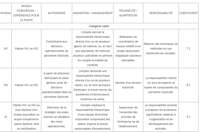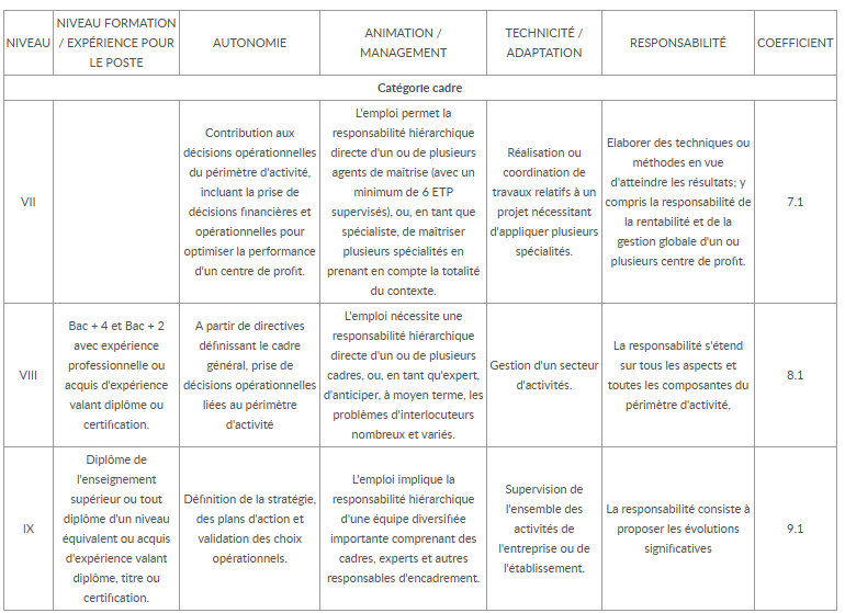 Les niveaux VII à IX se rapportent aux ingénieurs et cadres et portent sur les coefficients 7.1 à 9.1 (3 coefficients).